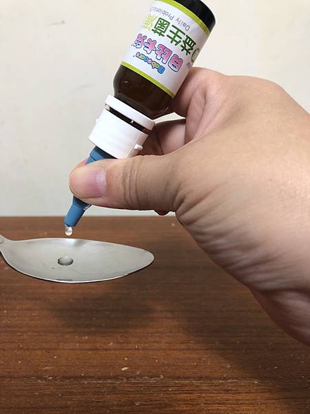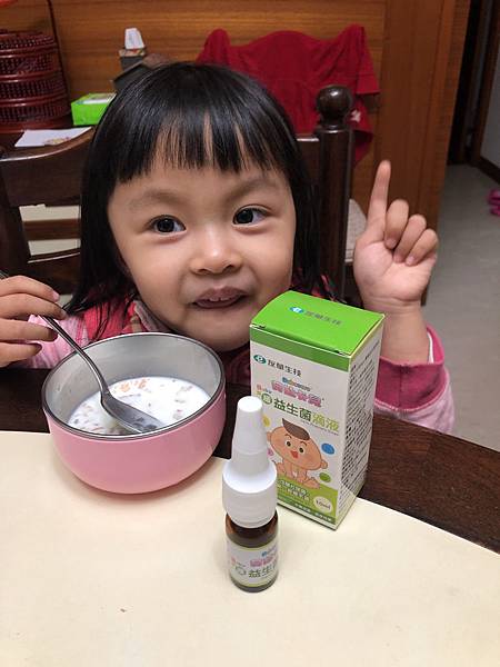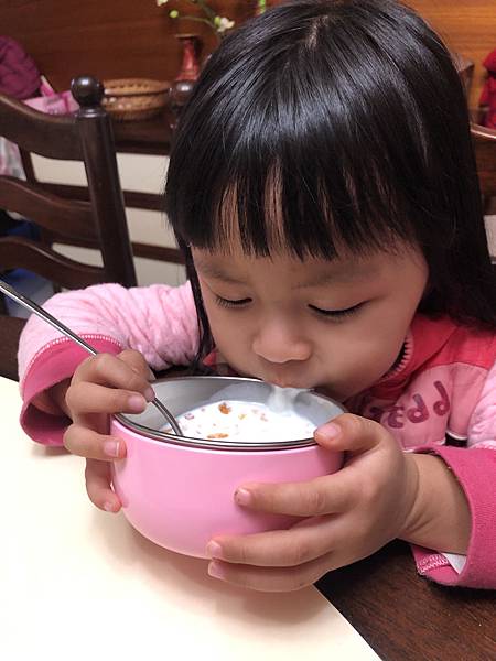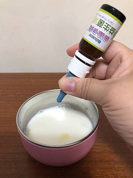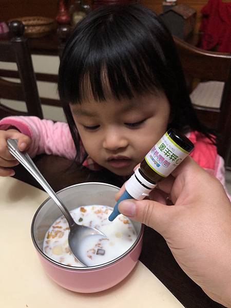 瑜瑜(2y8m)最近剛戒奶瓶和配方奶,才開始讓她練習跟我們一起吃早餐,所以我把貝比卡兒寶緩益生菌滴液直接滴在鮮奶中。