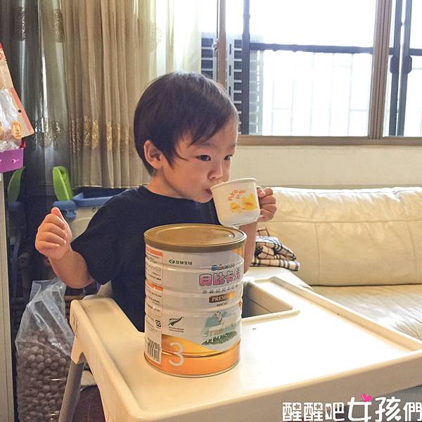 晚上在家裡,很開心一直說:「這是我的羊奶!」