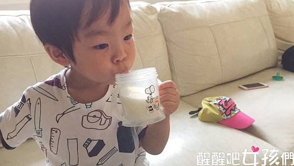 在喝之前我有跟他說這是羊奶喔!小捲很開心的喝了一口!表情遲疑了一下!但下一口就喝得很開心,直到喝光光!