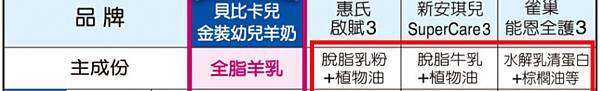 以下表格取自於貝比卡兒金裝幼兒羊奶粉官網與DM